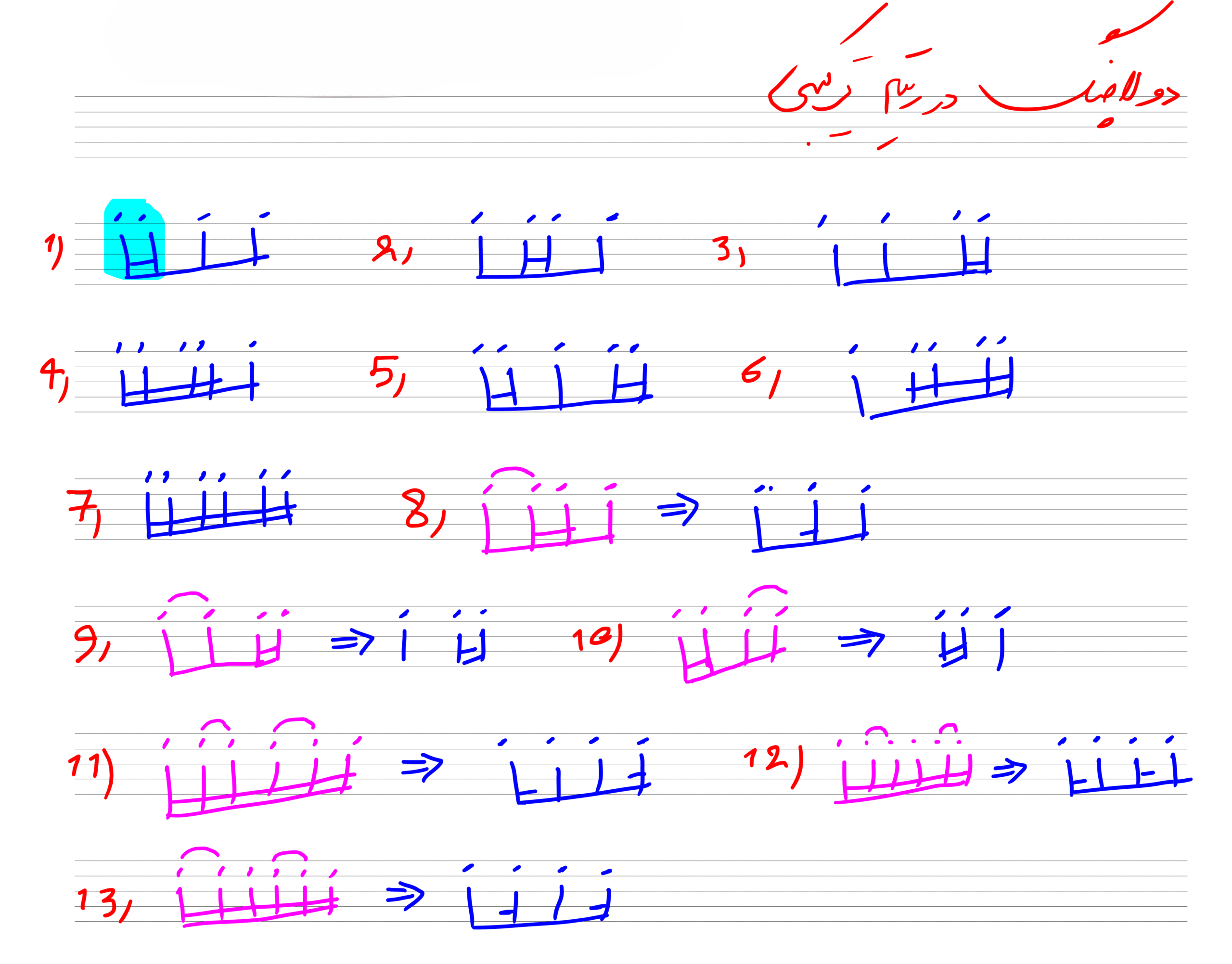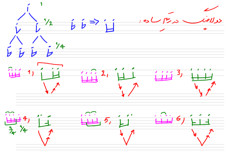 حالت هایی که برای یک ضرب ممکنه به وجود بیاد رو بررسی میکنیم و در نهایت همه میزان هایی که توی ریتم ترکیبی استفاده میشه رو یاد میگیریم